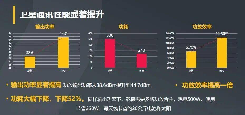 在卫星通信场景中,传统功放效率不足 10%,而得翼通信的 RPU 方案将功放效率提升至 35% 以上,输出功率从 38.6dBm 提升到 44.7dBm,同时功耗降低 52%,同样输出功率下,载荷耗电从 500W 降至 240W,每天线 公斤电池和太阳能板的重量,完美解决了卫星通信终端 “高功耗、大体积” 的行业痛点。