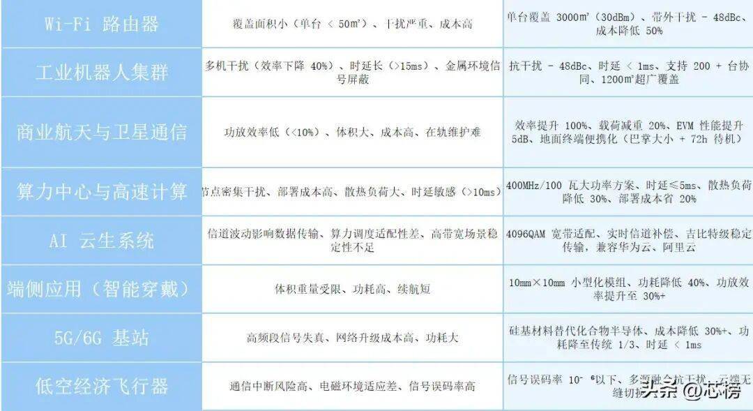 ⑥卫星通讯领域:适配太空极端环境,改善传统载荷能效低、寿命短的现状,通过射频增强技术实现载荷能效与通信容量双升,助力实现商业航天规模化发展。